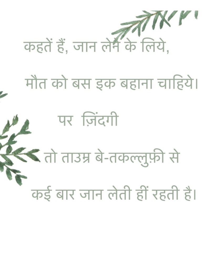 आँखें February 4, 2021February 15, 2021 Rekha Sahay14 Comments दो आँखों का रिश्ता- बेहद अज़ीब है। दोनों करीब है। ये रोती साथ हैं। हँसती भी साथ-साथ हैं। किसी से नफरत हो या मुहब्बत, एक साथ करतीं हैं। पर इनका ना कभी है सामना ना मुलाकातें। एक दूसरे से अजनबी, नावाकिफ, अपरिचित। नज़रों से नज़ारा देखतीं हैं ये एक साथ। सारा जहाँ देखती हैं साथ। पर ना देखा कभी एक दूसरे को। कभी सामना हुआ भी तब, तैरते अक्स आईने में दिख रहें हों जब। Rate this:Share this: Click to share on Facebook (Opens in new window) Facebook More Click to share on Pinterest (Opens in new window) Pinterest Click to share on Tumblr (Opens in new window) Tumblr Click to share on LinkedIn (Opens in new window) LinkedIn Click to share on Pocket (Opens in new window) Pocket Click to share on Reddit (Opens in new window) Reddit Click to share on X (Opens in new window) X Click to share on Telegram (Opens in new window) Telegram Like Loading...
