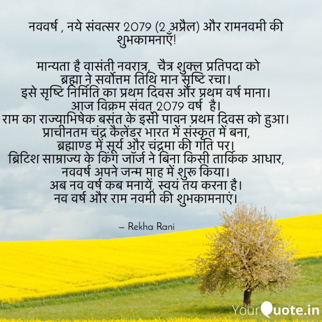 नववर्ष या नया संवत्सर 2079, (2 अप्रैल) और रामनवमी की शुभकामनाएँ मान्यता है वासंती नवरात्र, चैत्र शुक्ल प्रतिपदा को ब्रह्मा ने सर्वोत्तम तिथि मान सृष्टि रचा। इसे सृष्टि निर्मिति का प्रथम दिवस और प्रथम वर्ष माना। आज विक्रम संवत् 2079 वर्ष है। राम का राज्याभिषेक बसंत के इसी पावन प्रथम दिवस को हुआ। प्राचीनतम चंद्र कैलेंडर भारत में संस्कृत में बना, ब्रह्माण्ड में सूर्य और चंद्रमा की गति पर।ब्रिटिश साम्राज्य के किंग जॉर्ज ने बिना किसी तार्किक आधार, नववर्ष अपने जन्म माह में शुरू किया। अब नव वर्ष कब मनायें, स्वयं तय करना है। नव वर्ष और राम नवमी की शुभकामनाएं।