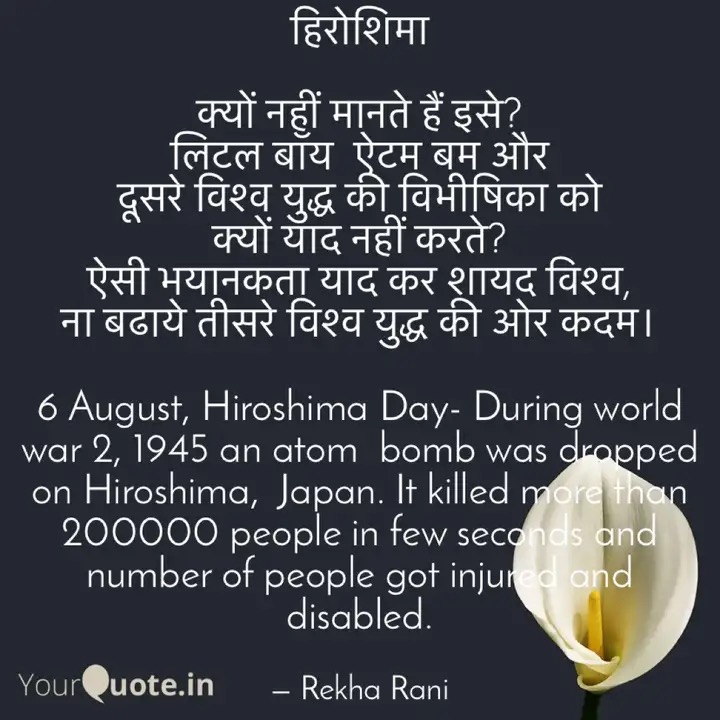 6 August, Hiroshima Day- During world war 2, 1945 an atom bomb was dropped on Hiroshima, Japan. It killed more than 200000 people in few seconds and number of people got injured and disabled.