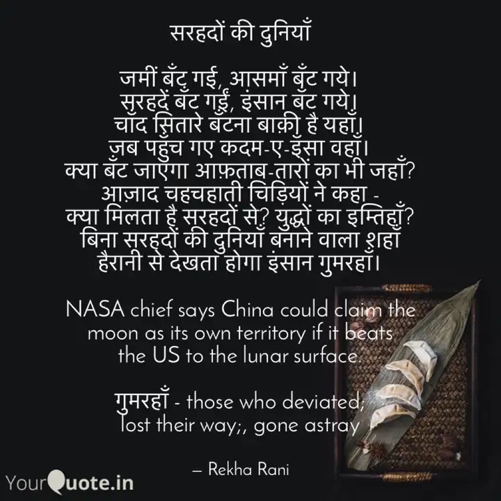 सरहदों की दुनियाँ January 4, 2023January 4, 2023 Rekha SahayLeave a comment NASA chief says China could claim the moon as its own territory if it beats the US to the lunar surface. https://news.yahoo.com/nasa-chief-says-china-could-105234428.html Rate this:Share this: Click to share on Facebook (Opens in new window) Facebook More Click to share on Pinterest (Opens in new window) Pinterest Click to share on Tumblr (Opens in new window) Tumblr Click to share on LinkedIn (Opens in new window) LinkedIn Click to share on Pocket (Opens in new window) Pocket Click to share on Reddit (Opens in new window) Reddit Click to share on X (Opens in new window) X Click to share on Telegram (Opens in new window) Telegram Like Loading...