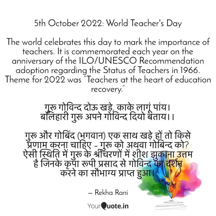 The world celebrates this day to mark the importance of teachers. It is commemorated each year on the anniversary of the ILO/UNESCO Recommendation adoption regarding the Status of Teachers in 1966. Theme for 2022 was “Teachers at the heart of education recovery.”