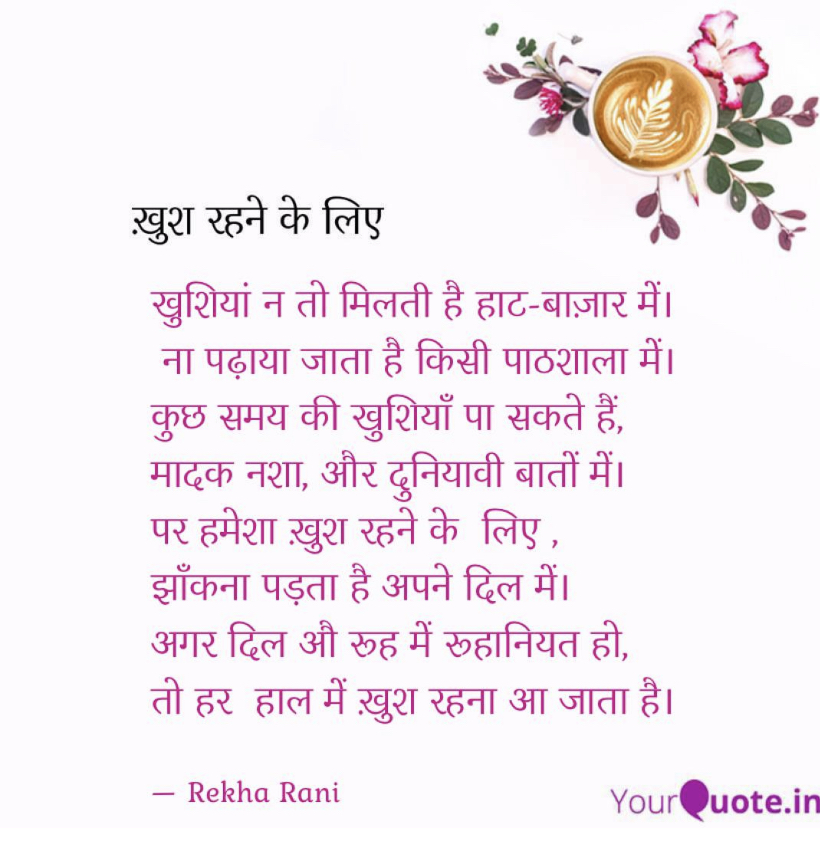 यह ख़ूबसूरत तस्वीरों वाली हिंदी कोट्स और कविताओं की किताब है। यह ऐमज़ान और फ्लिपकार्ट पर रेखा रानी की नाम से उपलब्ध है।