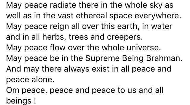 It is believed that by chanting this mantra, we move from our personal self and radiate a prayer of love for the world around us. This Sanskrit mantra is from one of the Mangala (auspicious) Mantra often recited after a pooja, yoga or religious ceremony.